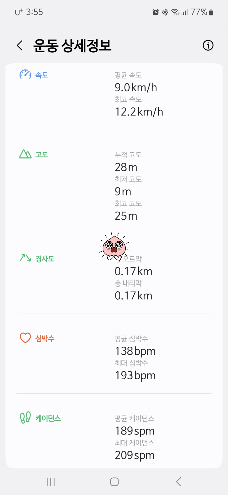 운동 세부사항으로 들어가서 보니 쵣애 193bpm이 찍혀있는. 이 상태로 계속 뛰었으면 큰일날뻔했어요.