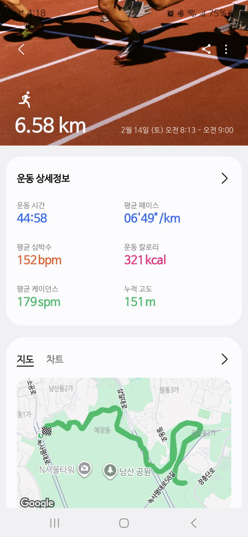 또한 남산은 경사가 완만하게 이어져 있어 인터벌 훈련이나 근지구력 훈련에도 적합합니다. 평지 러닝과는 또 다른 자극을 받을 수 있습니다. 누적고도 151m니까 평지에서만 달리던 저에겐 또 하나의 챌린지 같았어요.