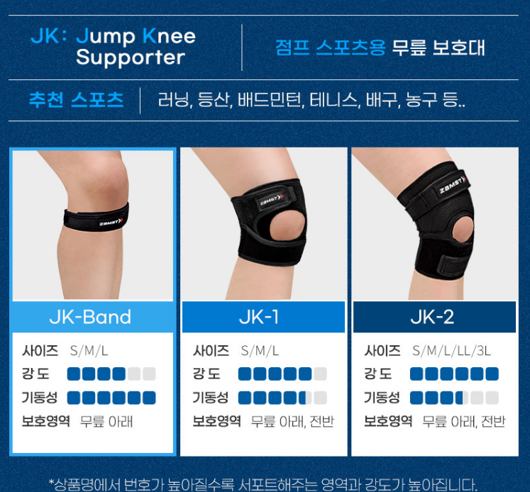 이 중에서 제가 쓰는 제품은 바로 잠스트. 김연경이 모델이네요. 짱짱하니 잘 잡아줍니다. 이거 선물로 주신 분이 여러 브랜드 많이 써봤지만 이 제품이 최고라고 하더라고요. 다이소에서도 무릎보호대 사서 써봤는데 그거보다는 잠스트가 더 짱짱한 느낌이에요.