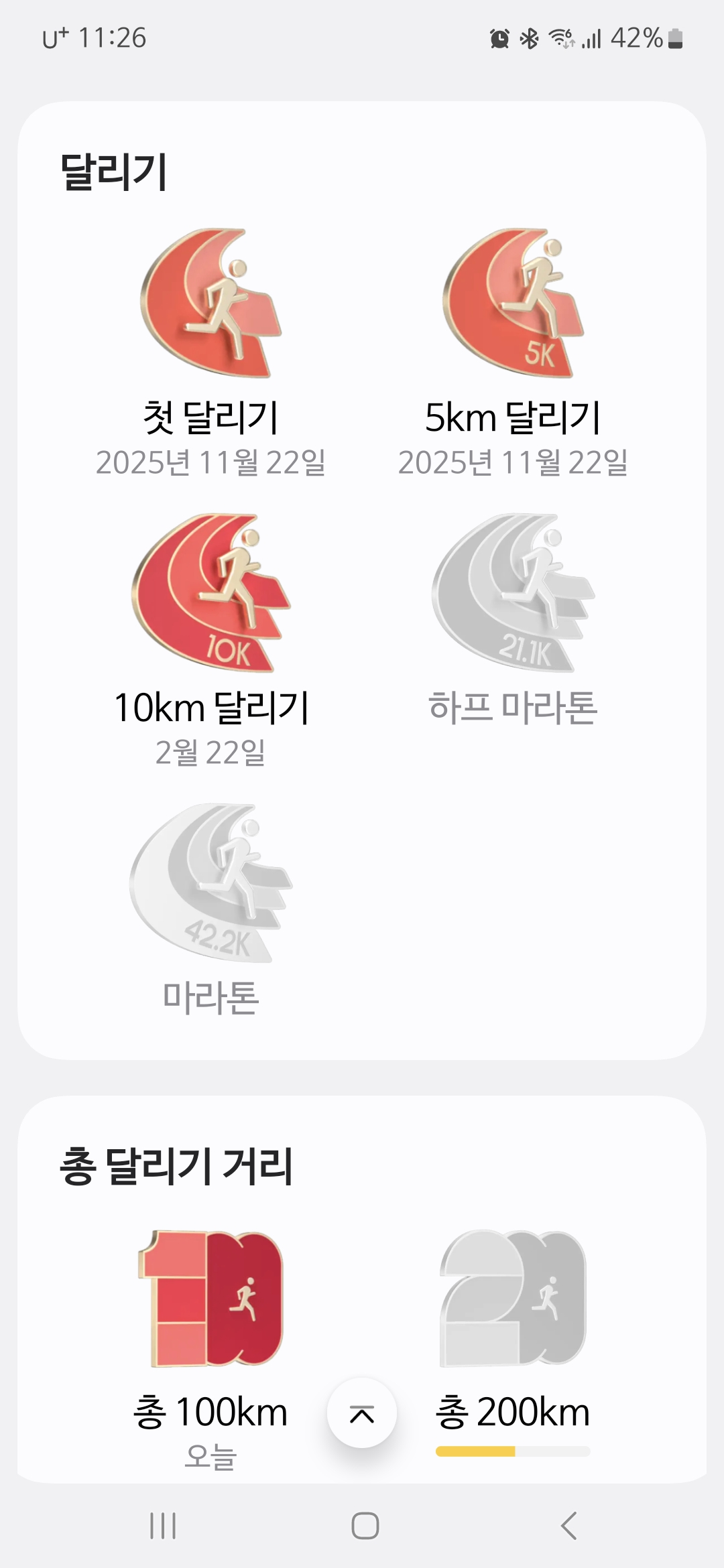 저는 개인적으로 삼성 헬스 앱에 만족하고 있습니다. 언제 얼마나 뛰었는지, 걸었는지 모든 활동이 자동으로 기록되고, 처음 10km를 완주했을 때 앱이 축하 메시지와 함께 뱃지를 준 게 너무 뿌듯했습니다. 누적 100km를 달성했을 때도 마찬가지였고요. 복잡한 기능보다는 심플하게 기록만 잘 남기고 싶다면 삼성 헬스만으로도 충분합니다.