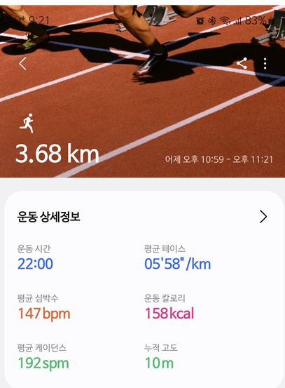아디다스 아디제로 EVO SL 러닝화를 샀는데 쿠션감이 좋아서 그날 페이스 5.58분대로 뛰었어요. 그렇게 뛰니까 5km를 채우기도 힘들더라고요. 3.68km만 뛰고 집에 들어왔는데 그렇게 뛰면 부상 당할 수 있다고 합니다.
