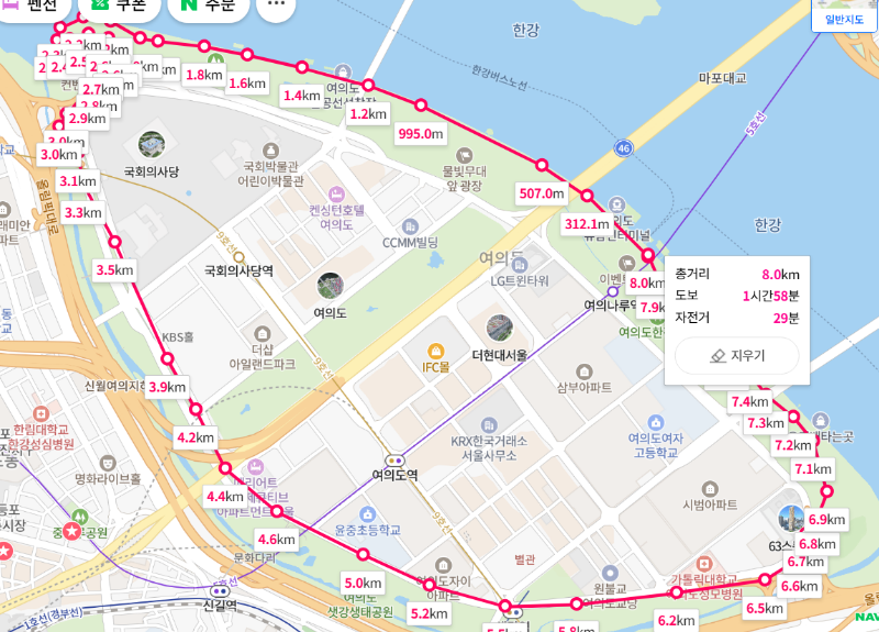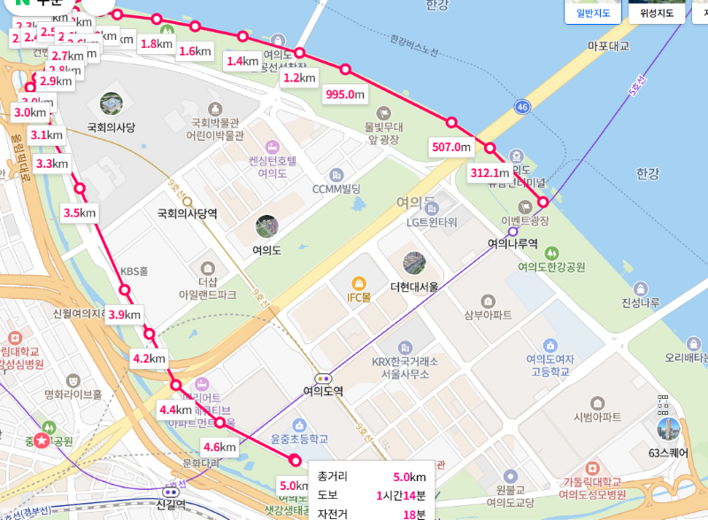 계속 눈여겨보던 코스, 여의도 고구마런을 위해 거리재기를 해봅니다.